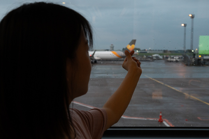 雨逐渐停了,云依然厚。不过哥本哈根机场有Thomas Cook的班机(后来查了一下好像是个旅游公司?),Logo是个爱心,为阴天增加了一抹亮色。借着飞机尾翼比个心。
