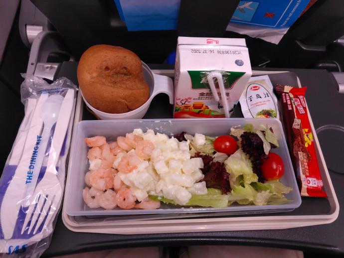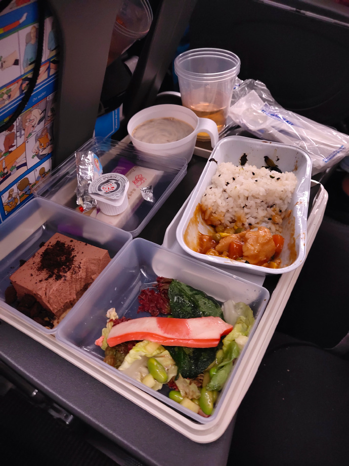 过了一会居然开饭了,手机时间才下午三点多,难道开饭要算时差吗?索性把两顿都放上来,前面是下午餐,后面是深夜餐。比起我坐过的国内航班经济舱还是不错的。