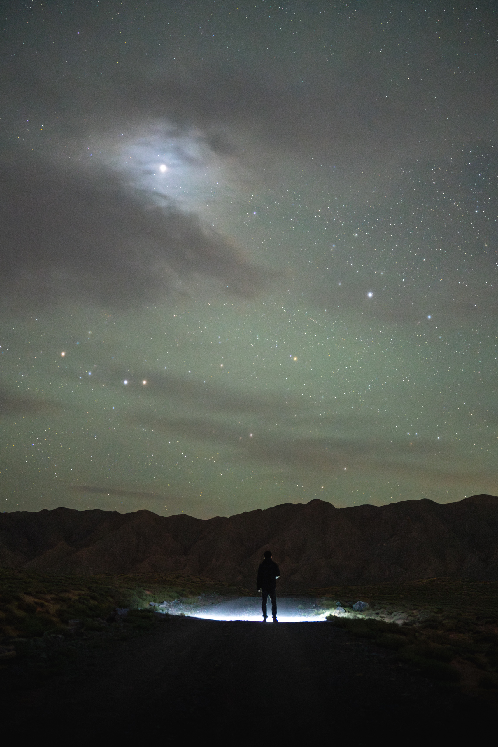 张掖在河西走廊中间,南北都是山,南面是祁连,北面的山我不知道名字,当地人叫北山,翻过去是阿拉善右旗。英仙座位于东北方向,半夜升起,决定先去北山脚下看看。小羽说当地城镇化时很多墓都被迁到了北山脚下,这并不是一个看流星雨的好地方。我原以为只有一小片,结果还离得很远就看到了戈壁上有些小小的建筑,看不清是什么,并不像是村落,懂的都懂。这下完全避不开了,还是去找别的地方吧。