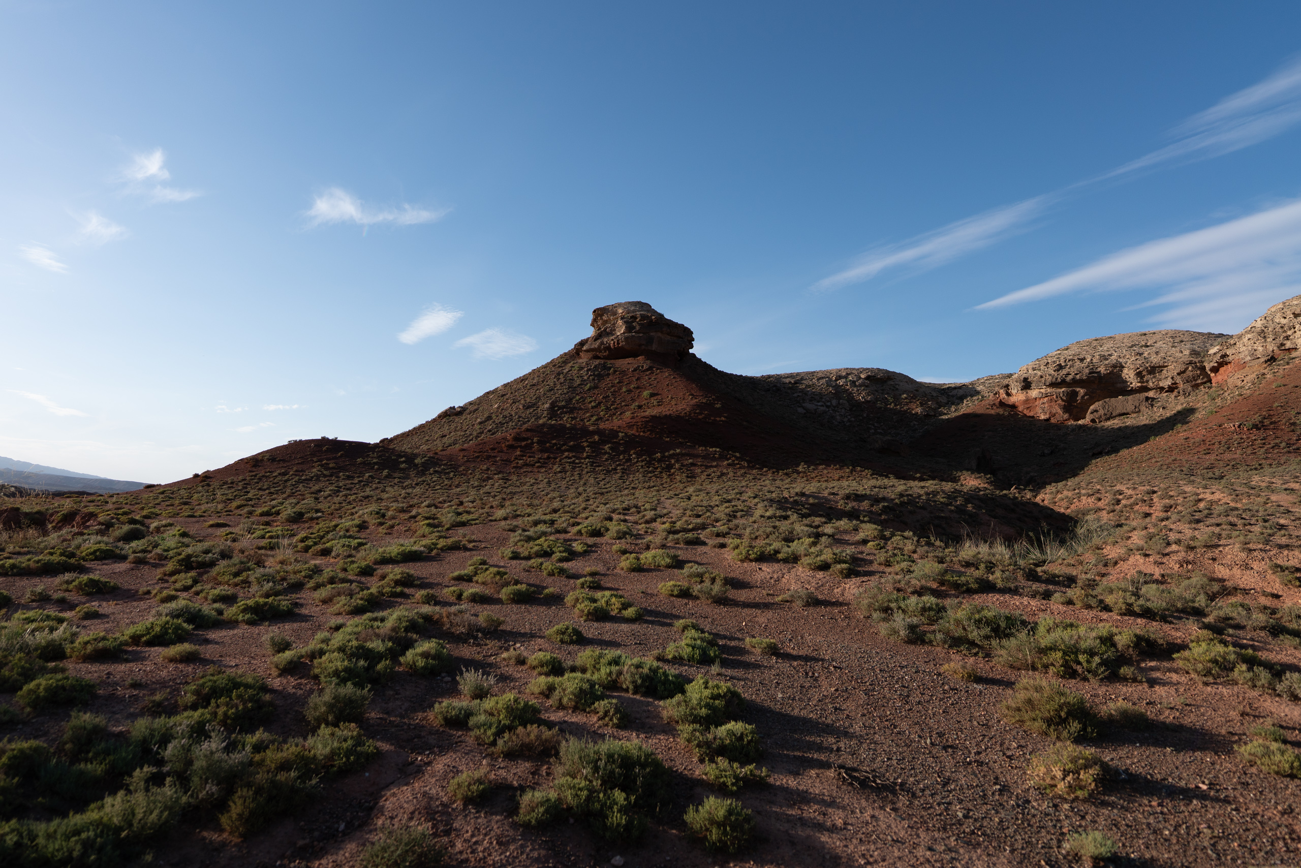翻过了北山,是另一幅景象,远远地看见一座矮山,像是内蒙古大红山那样一个土台。这个地景真是深得我心。这里叫做红寺湖,却并没有湖。沿着公路一直下坡,转了个很大的弯,几乎来到了矮山后面,结果路边的牌子上赫然写着“军事区禁止摄像”。#¥#@!¥(!&(¥,一个小时的车白开了。