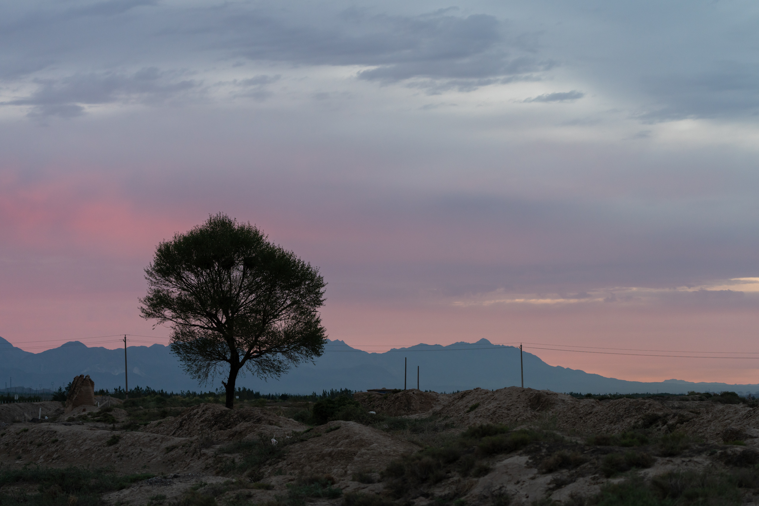 又休息了一会才驱车回家。路上天色渐亮,挡住星空的云层带来了一些粉色的霞光。连着两天缺乏睡眠,我有点恍惚,为了安全把车停在路边,喝水、洗脸,清醒一下。望着被蓝调笼罩的荒野、孤树、长城的遗址和远处的山脉,发着呆。