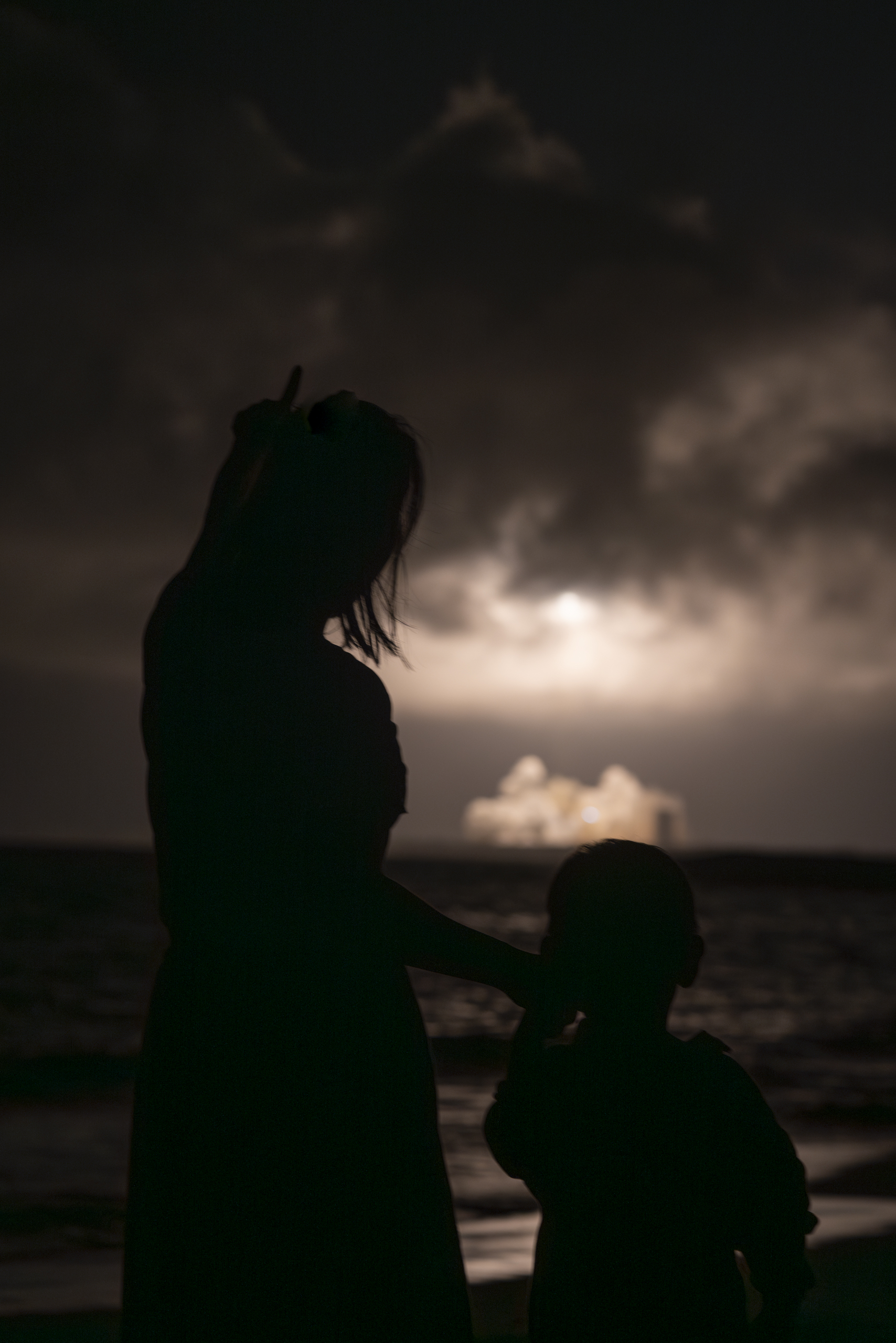 光芒飞升,照亮了一切,慢慢穿过发射塔上空的云层。我跪在沙滩上,从取景器中看到那团光从他们中间越飞越高,飞过了头顶。小羽抬起头,挥手告别,小万万却依然向前看着塔架,呆在那里,直到我拍拍他,叫他抬起头向上看。