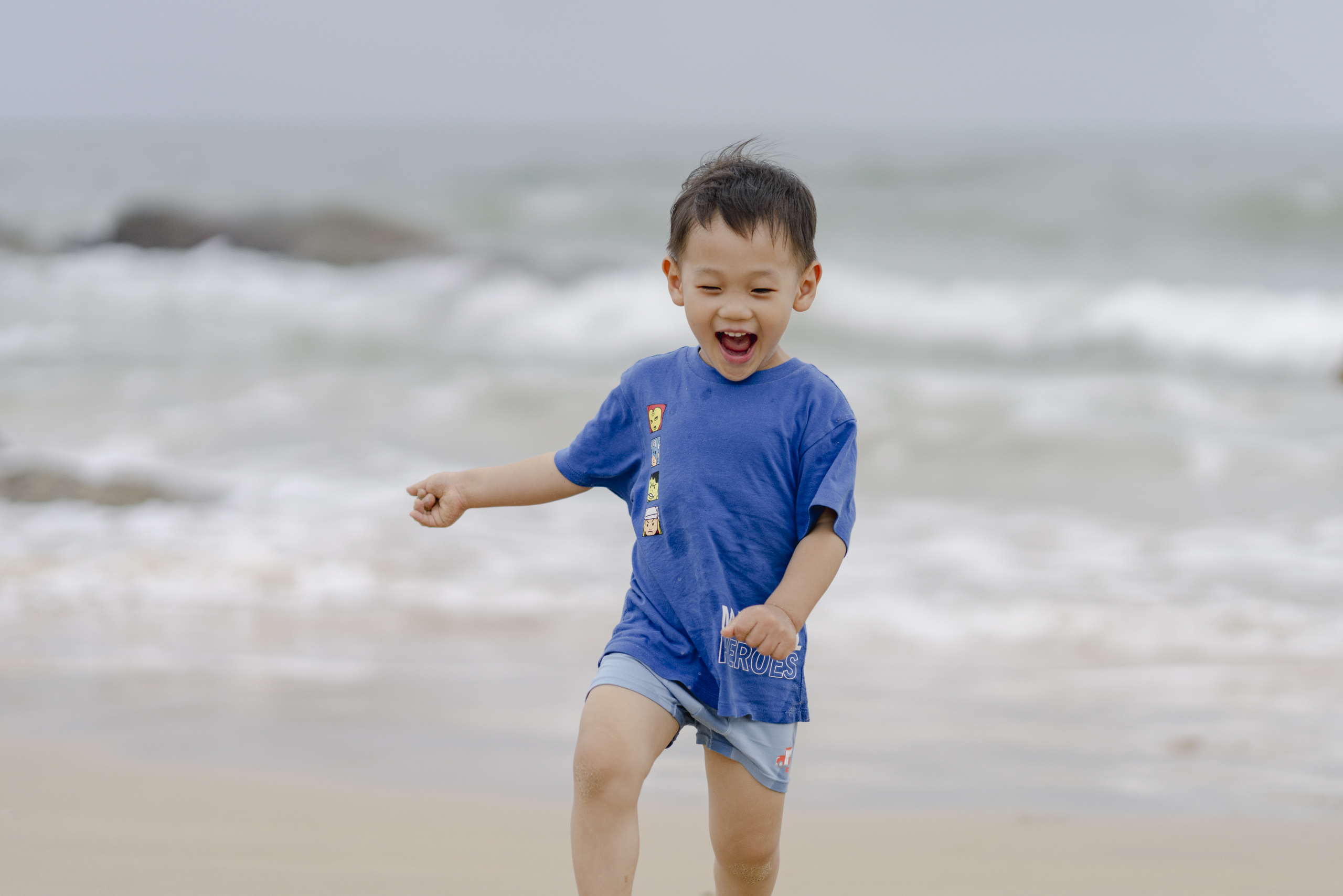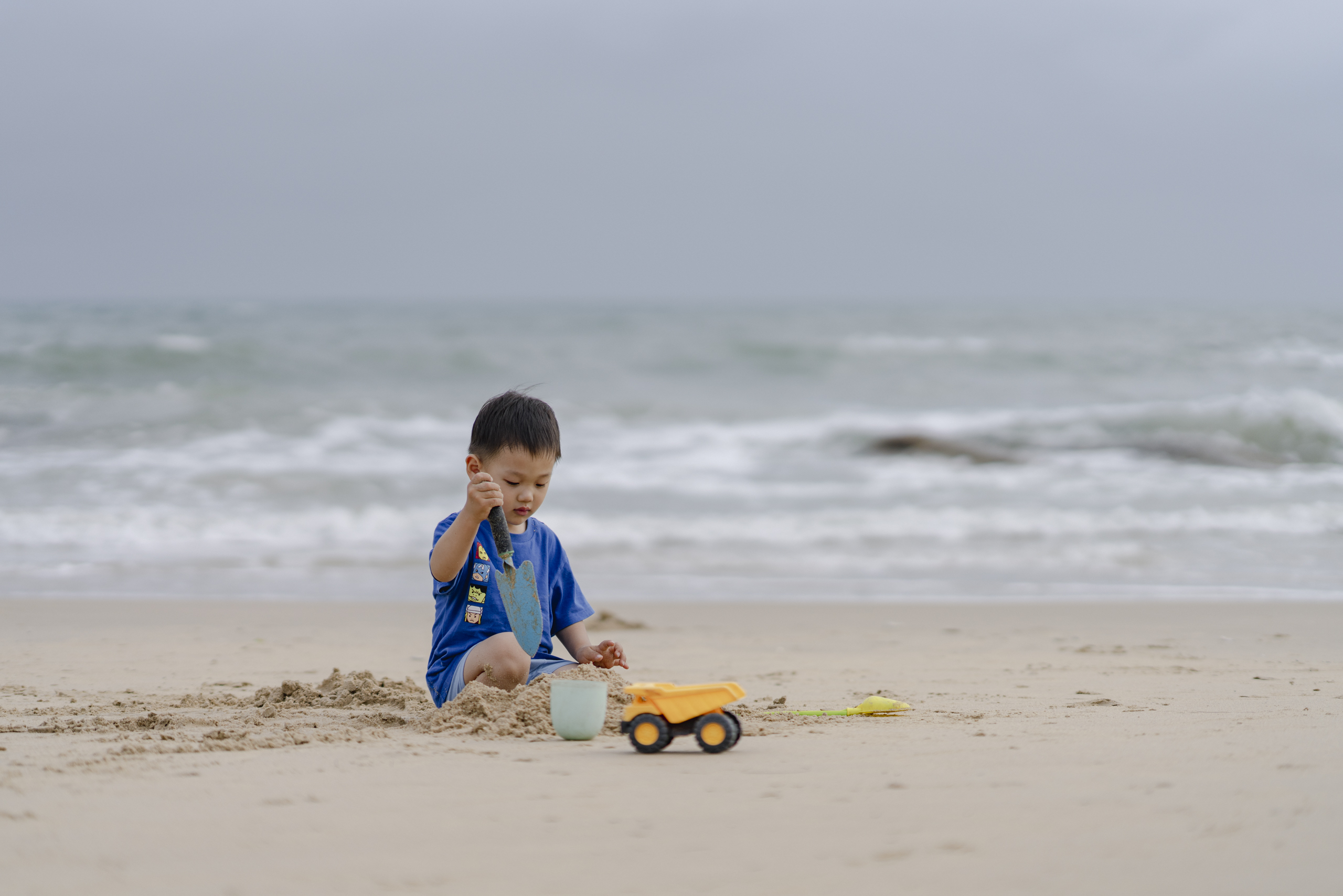 带小万万走过沙滩,他很兴奋,开始挖坑。我拉着他来到海边,想让他感受一下海水冲到脚上,结果海浪的轰鸣声把他吓哭了,之后就再也不肯接近水了。他就是这样一个敏感的孩子,看着旁边一个比他小的小妹妹跟父母踩水踩得不亦乐乎,他也无动于衷,还是远离海水,自己挖坑。小羽用小水桶提水,让他过去拿,海浪一冲过来他就跑😂。
