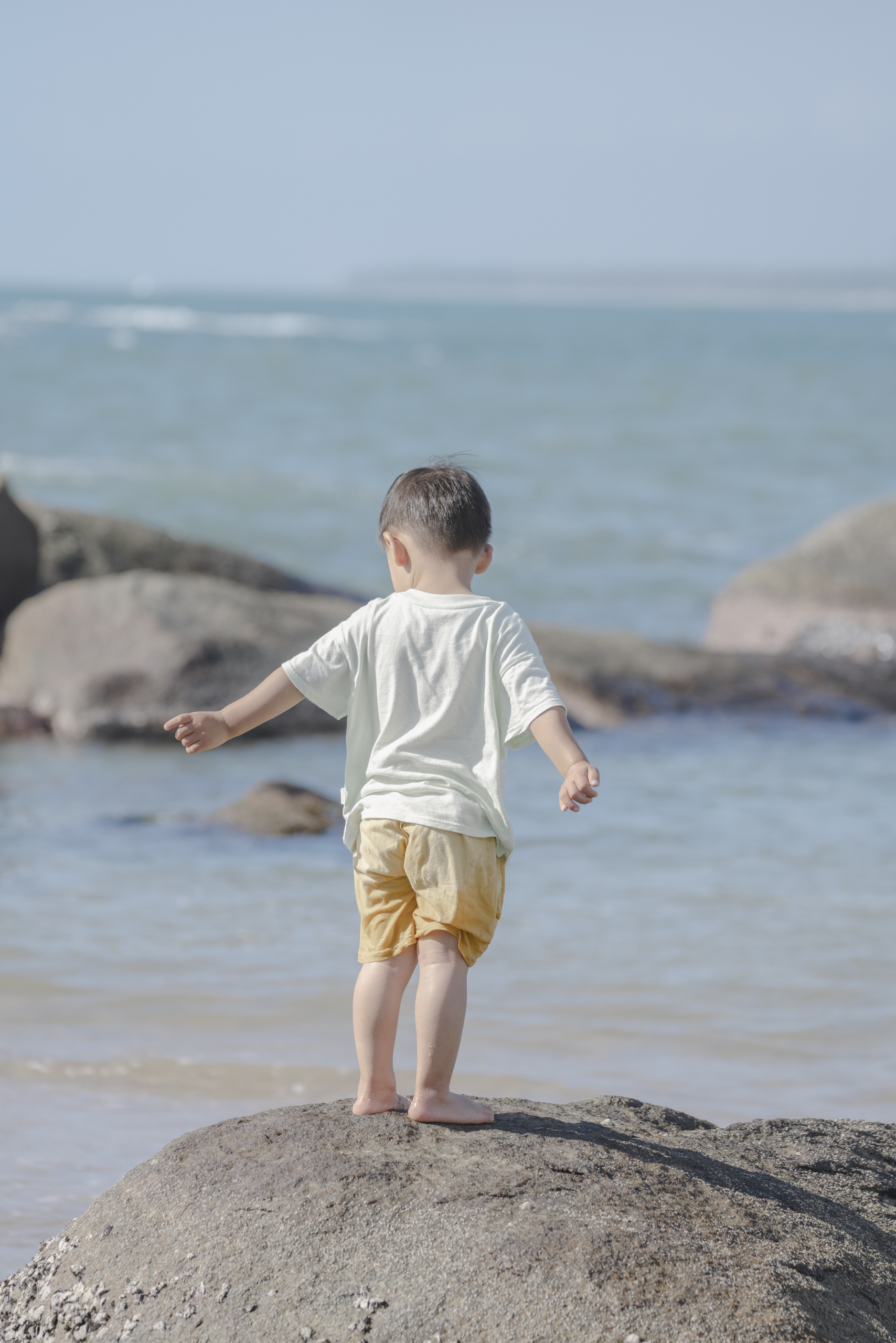 海边有几块巨大的礁石,隔离出了一些浅滩,水流缓慢,退潮时可以从浅滩爬到石头上。没了海水的冲击力和轰鸣声,小万万再也不紧张了。挖坑、捡贝壳、追螃蟹、抓小鱼。我们爬上大石头,上面有大大小小的潮池,里面也有些小鱼,游得飞快,小万万拿着小桶在水里推来推去试图抓住它们。