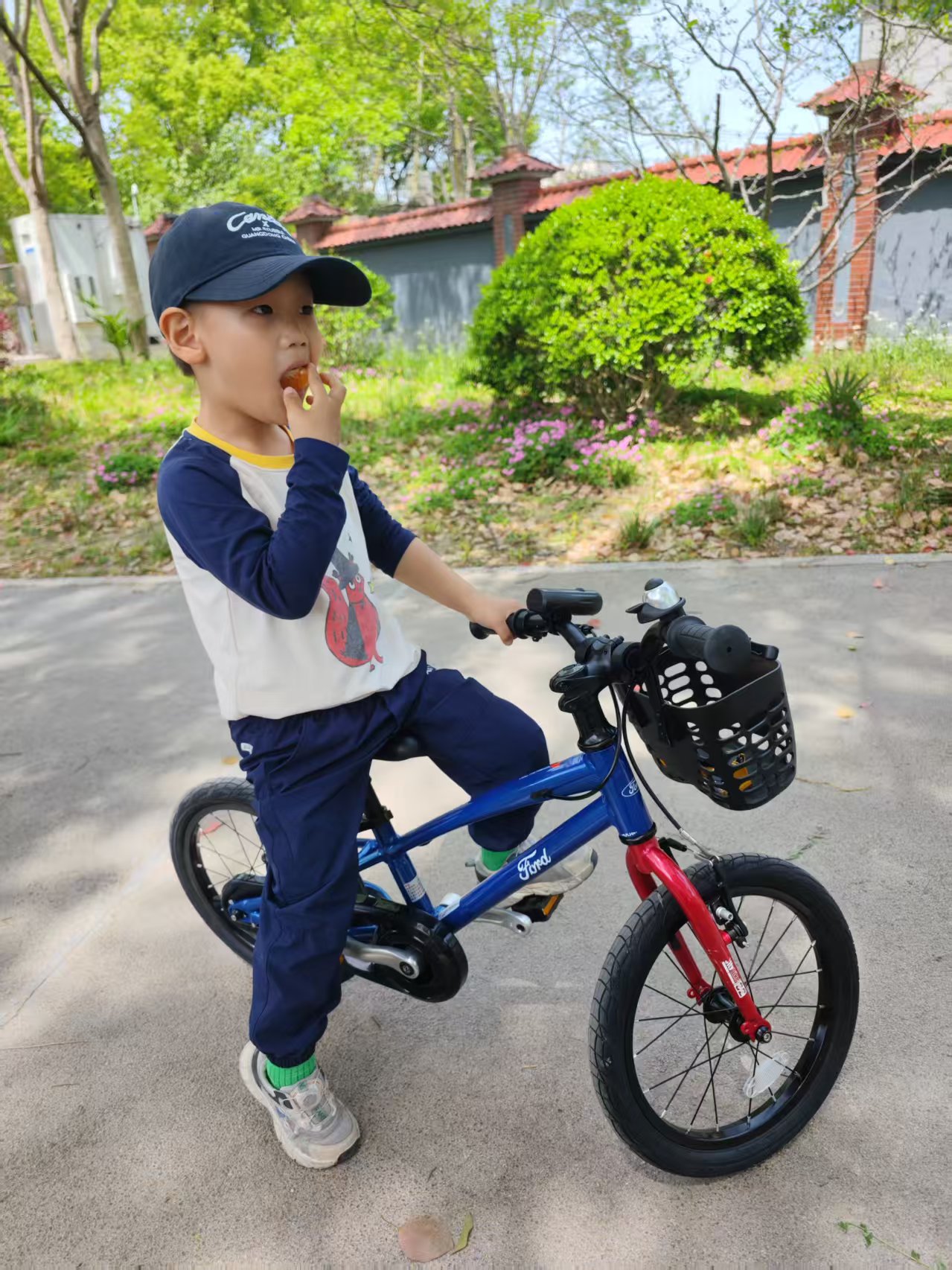 小万万原来的坐骑是一辆红色的14寸迪卡侬自行车。最近春暖花开,带着他去了环迪斯尼绿道骑车,一碰到有岔路短暂分离然后再交会就咯咯咯的笑。还有一次在明镜荡断断续续骑了10公里。这两小车已经渐渐不堪重负,身高马上要超过上限了,踏频飞快速度却很慢,于是有了换车的想法。