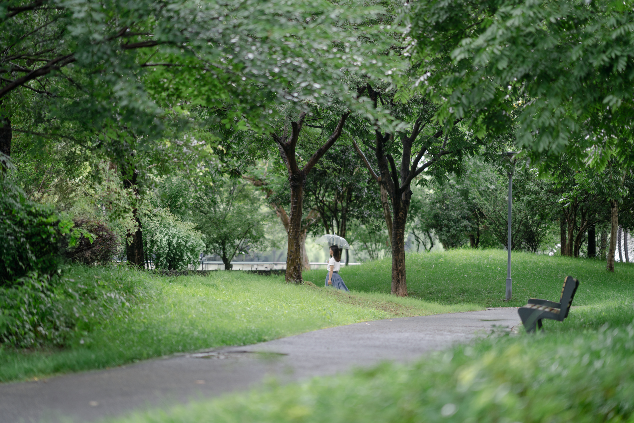 入梅后雨很多,一个下着雨的下午,拿了透明伞,去河边绿地散步。
